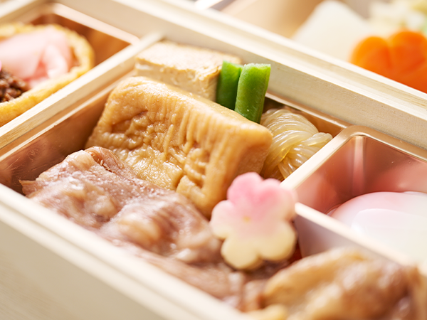 「ん」の付く物を食べると「運」を呼び、なかでも「ん」が二つ付く物は二倍の運を呼び込めると言われています。これらの食材七つを盛り込んだとてもおめでたいお弁当です。