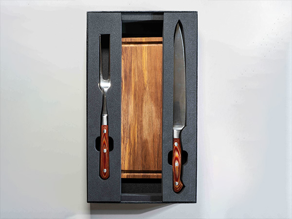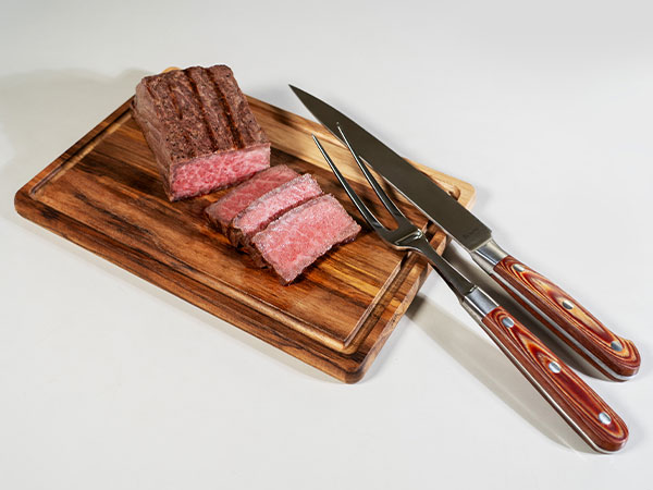 お客様ご自身で黒毛和牛ローストビーフを切り分ける“ひととき”を愉しんでいただけるよう、専用のカッティングボードとカービングナイフ、フォークをセットにてお届けいたします。